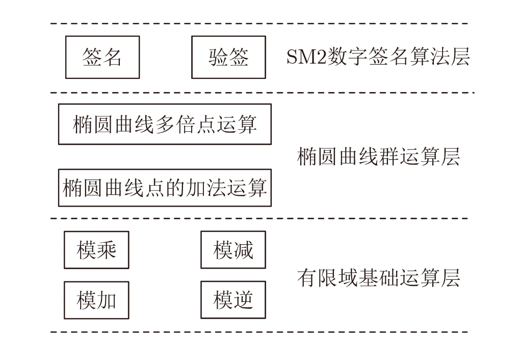 作为椭圆曲线非对称加密算法的一类,SM2算法在计算数字签名时所执行的操作与其他椭圆曲线类似,主要涉及有限域运算、椭圆曲线运算和数字签名运算三大类计算操作,三类操作之间自底向上形成层级调用关系。经过抽象算法结构和筛选主要运算后,我们绘制出如图1所示的核心运算层次图: