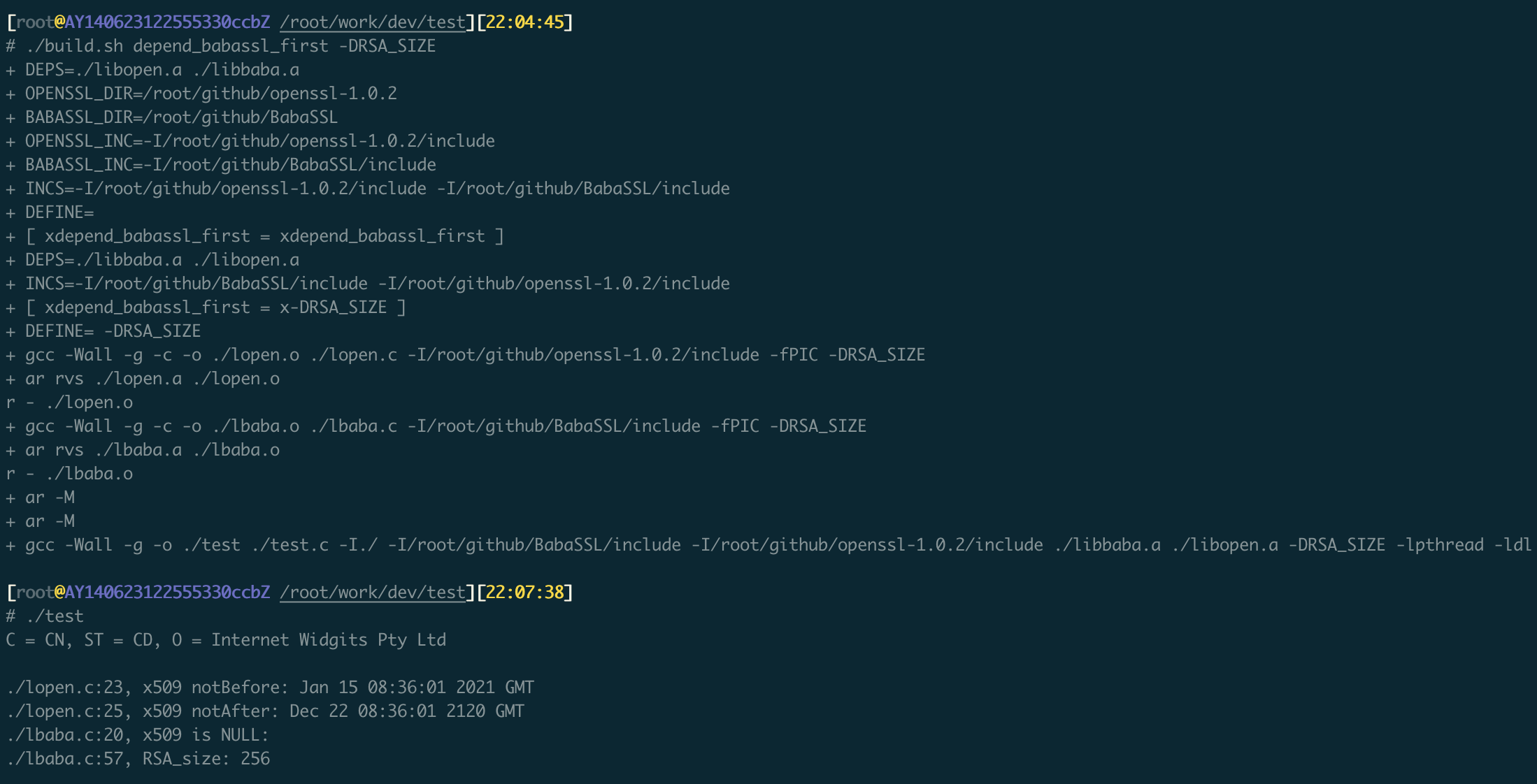 gcc -Wall -g -o ./test ./test.c -I./ -I/root/github/openssl-1.0.2/include -I/root/github/BabaSSL/include ./libopen.a ./libbaba.a -lpthread -ldl -DRSA_SIZE