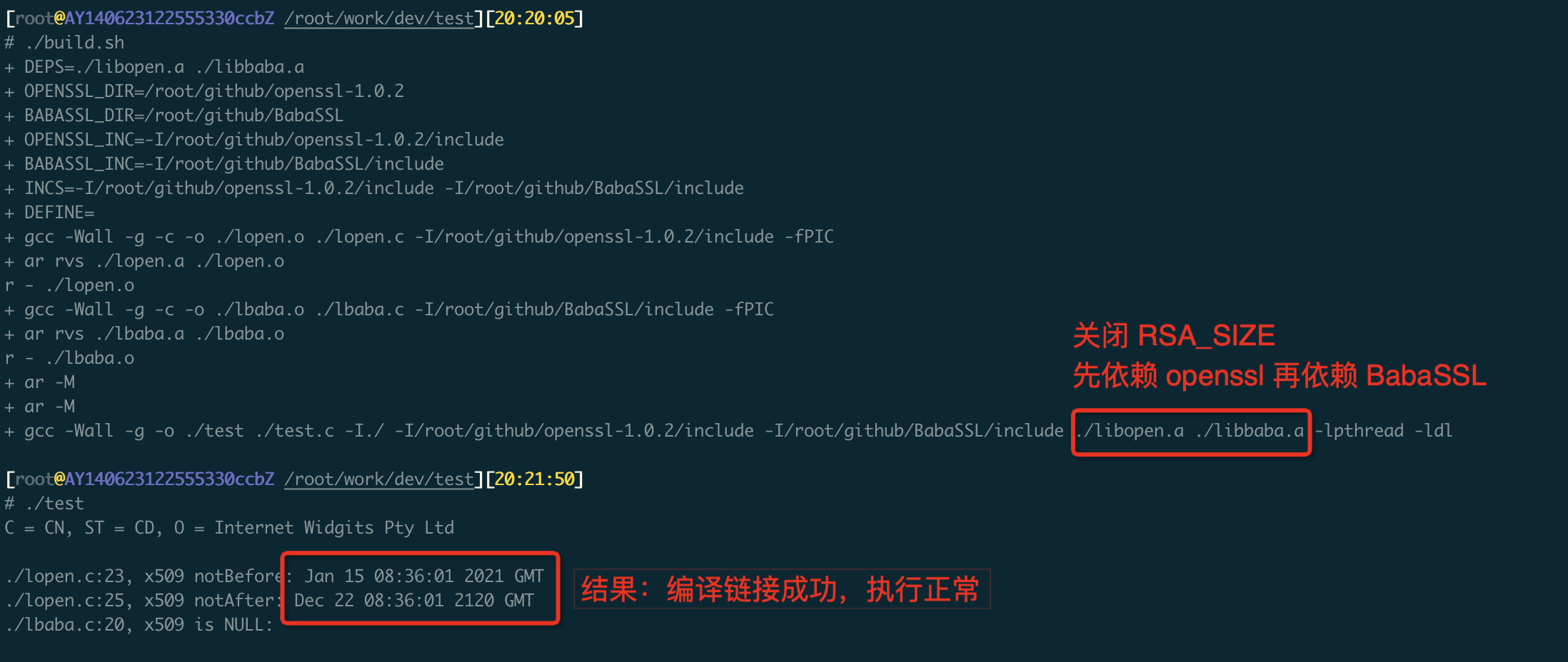 应用程序 test 分别调用静态库 lopen.a 和 lbaba.a 提供的接口:print_cert_info、 print_x509_valid_time、print_rsa_size